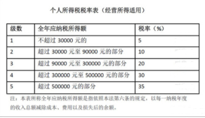 2.个人所得税(经营所得),按超额累进税率征收,就是年底收入总额减除成本,费用和损失后的余额,按照下表缴纳个人所得税(经营所得):